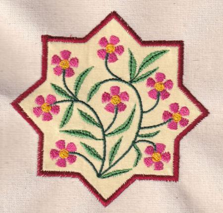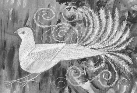 A couple of months ago I was busy preparing pieces to exhibit at our NEOS show. I had recently finished work on a flock of siskins – those little brightly coloured birds which we have in abundance here in the Scottish Highlands. I chose a simple light green background to stitch them out on, but when I saw the result I wasn’t happy. These little birds are always scurrying around in the middle of leafy trees and bushes, and the stitchout just looked too plain and bare to me
